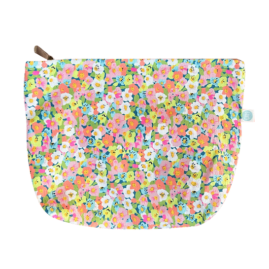 Bolsa necessaire com padrão flores coloridas, ideal para guardar essenciais do dia-a-dia: telemóvel, carteira, chaves, óculos...