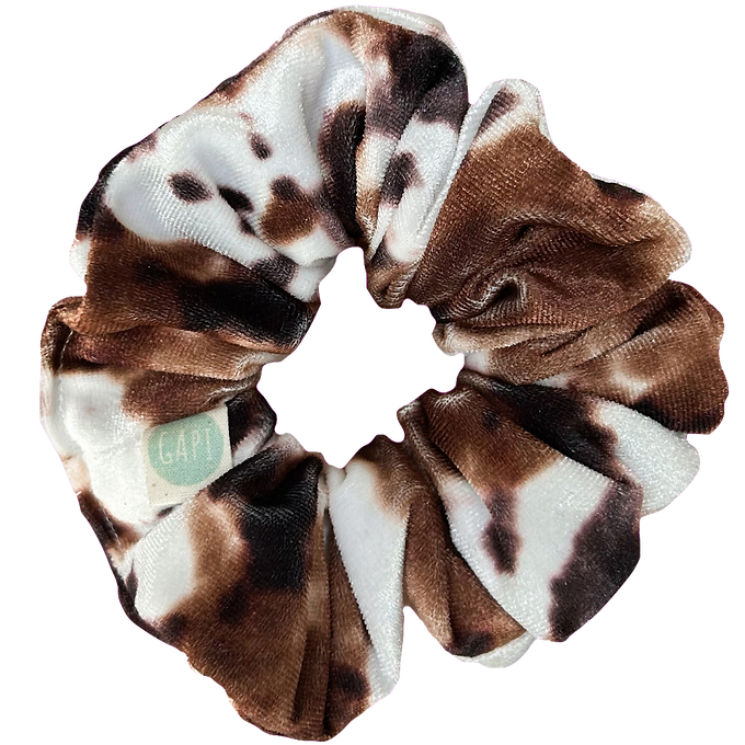 O scrunchie ZIPPER COWGIRL tem o padrão do momento - o padrão vaca (castanha).